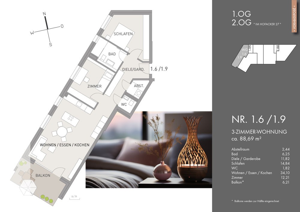 Im Hofacker 27 steht für ein Zuhause, das mehr ist als nur vier Wände: Es ist ein Ort, an dem Geborgenheit, Stil und nachhaltiger Komfort spürbar werden. Die moderne Architektur mit klaren Linien und zeitloser Farbgebung vermittelt Wertigkeit und Beständigkeit – ein Zuhause, auf das man stolz sein kann. Große Fensterflächen und die ideale Südausrichtung lassen die Räume im Tageslicht erstrahlen. Damit entsteht ein Wohngefühl voller Leichtigkeit und Energie. Elektrische Rollläden schenken Komfort und Sicherheit, während die Fußbodenheizung für gleichmäßige Wärme und Behaglichkeit sorgt. Auch in der Ausstattung spiegelt sich Anspruch und Qualität: Hochwertige Bäder schaffen eine Atmosphäre von Wellness im Alltag. Aufzug und Tiefgarage garantieren Bequemlichkeit – Werte, die den Alltag erleichtern und langfristig zählen. Die Zukunft fest im Blick: Als Effizienzhaus 55 mit Solaranlage überzeugt das Projekt mit niedrigen Energiekosten, Unabhängigkeit von steigenden Preisen und einem klaren Bekenntnis zur Nachhaltigkeit. Das insektenfreundliche Licht- und Pflanzkonzept verbindet Ökologie mit Ästhetik – ein Zeichen von Verantwortung und Weitsicht. So entsteht ein Wohnumfeld, das zugleich schützt, inspiriert und langfristig Bestand hat – ein Zuhause, in dem man ankommen und bleiben möchte. Highlights auf einen Blick • Moderne Architektur mit klarer Linienführung und zeitloser Farbgestaltung • Großzügige Fensterflächen & ideale Südausrichtung für lichtdurchflutete Räume • Elektrische Rollläden und Videosprechanlage für Komfort & Sicherheit • Fußbodenheizung in allen Wohnräumen • Hochwertige Badausstattung mit Wohlfühlcharakter • Aufzug & Tiefgarage mit direktem Zugang • Automatische Türverriegelung der Hauseingangstüre • Effizienzhaus 55 – energieeffizient & zukunftssicher • Solaranlage zur Nutzung erneuerbarer Energien • Insektenfreundliche Beleuchtung & nachhaltiges Pflanzkonzept